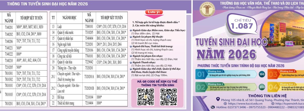 Trường Đại học Văn hóa, Thể thao và Du lịch Thanh Hóa vừa ban hành Thông tin tuyển sinh đại học chính quy năm 2026, trong đó công bố chi tiết danh mục ngành/chương trình đào tạo, mã ngành và các tổ...